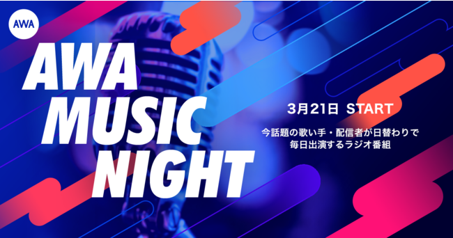 AWA株式会社(本社:東京都港区、代表取締役CEO:冨樫晃己)が運営する、サブスクリプション型(定額制)音楽ストリーミングサービス「AWA(アワ)」は、ユーザー同士がリアルタイムに、同じ空間で同じ音楽を楽しみながらチャットができるオンライン空間「LOUNGE(ラウンジ)」の音声ライブ配信機能の一般解放を前に、3月21日より人気の歌い手7 名がおくる、特別番組「AWA Music Night」を配信スタートいたします。さらに、7名がインターネットTV「ABEMA」で放映されるAWAのCM出演をかけたキャンペーンもスタート。