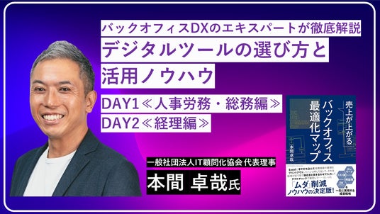 本セミナーは、「人事・総務編」(初日)、「経理編」(2日目)からなり、労務管理や人材マネジメント、請求書の発行などのバックオフィス(間接部門)の悩みをカテゴリ別に分析します。