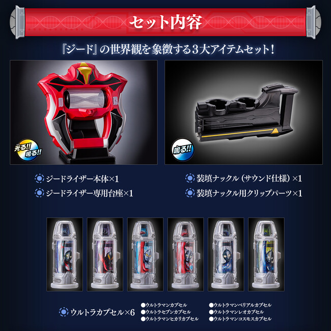 『ウルトラマンジード』関連アイテムの第1弾となる本商品には、ジードライザー本体と専用台座、装填ナックル、6種類のウルトラカプセルがセットになっており、DX版(放送当時に発売されていた「DXジードライザー」)から大幅に進化したなりきり遊びが楽しめます。