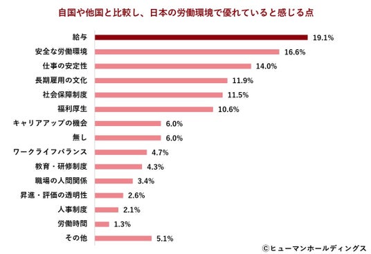 日本の労働環境で優れている点(単一回答)として最も多く挙げられたのは「給与」(19.1%)でした。日本の給与水準は、一定の安定性と信頼性が評価されていることが読み取れます。特に経済が不安定な国や、非正規雇用が主流の地域と比べた場合、継続的に収入を得られるという点に安心感があるのかもしれません。