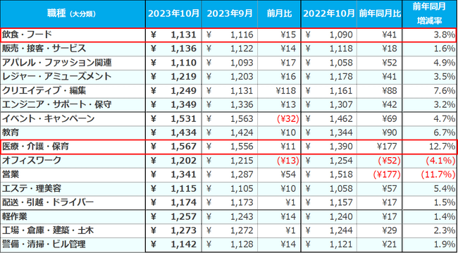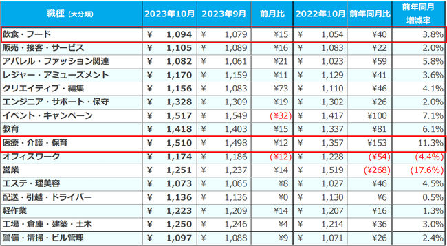 最低賃金改定後初の調査ということもあり、多くの職種で時給が上がっていることがわかる。