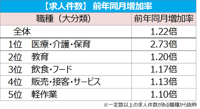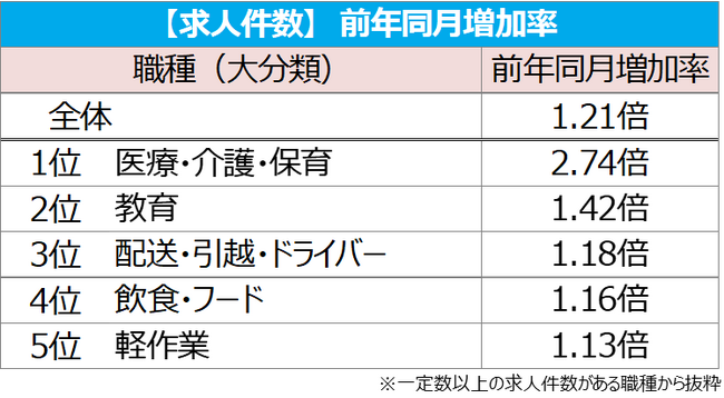 また、[医療・介護・保育]は、1,510円(前月比:+12円、前年同月比:+153円)で、調査開始以来はじめて1,500円台となり、求人件数は前年同月比で約2.7倍に増加した。