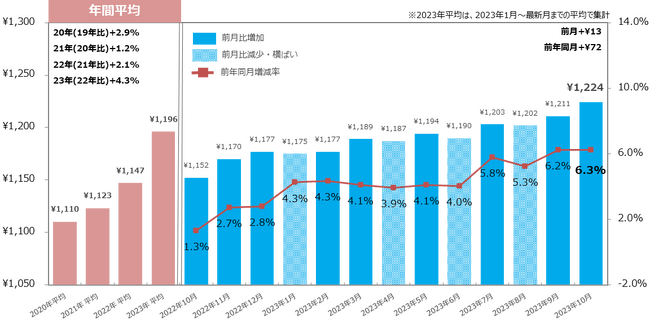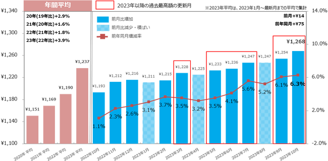 「関東」は1,303円で前月比19円の増加、前年同月比74円の増加(増減率:+6.0%)となり、2020年1月の調査開始以来はじめて1,300円を超え過去最高額を更新。