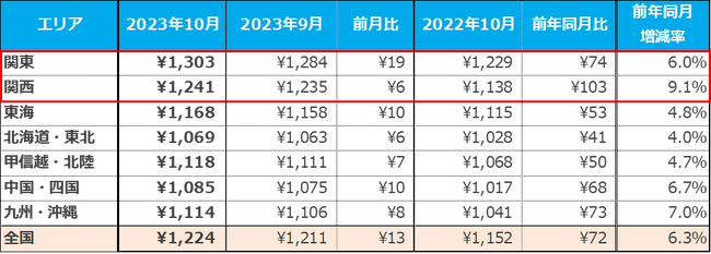 また、「関西」は1,241円で前月比6円の増加、前年同月比103円の増加(増減率:+9.0%)となり、2カ月連続で過去最高額を更新した。 【図4】
