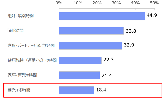 また、現状週休3日制を利用していない人に対し「週休3日制になったら余暇時間をどう使いたいか」と聞くと「趣味・娯楽時間(44.9%)」、「睡眠時間(33.8%)」、「家族・パートナーと過ごす時間(32.9%)」が上位に並び、「副業する時間」の回答は18.4%に留まった。収入アップにつながるとはいえ、「せっかく増えた余暇に勉強やリスキリング、仕事はしたくない」と考える人も多いようだ。【図3、4、5】