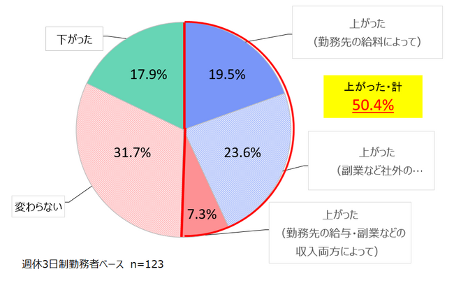 週休3日制に対するイメージは「収入が減りそう(37.5%)」が最多で、「正社員では難しそう(25.1%)」、「時間内に業務が終わらず残業が増えそう(23.8%)」とマイナスイメージな回答が上位に並んだ。しかし、実際に現在の勤務先で週休3日制で働く人に、収入の変化を聞くと「上がった(50.4%)」が「下がった(17.9%)」を大きく上回る結果になった。また、そのうち約3割が副業などにより収入がアップしていることから、正社員としての就労先での賃金アップにこだわらず、多様な働き方をする層がいることが分かった。