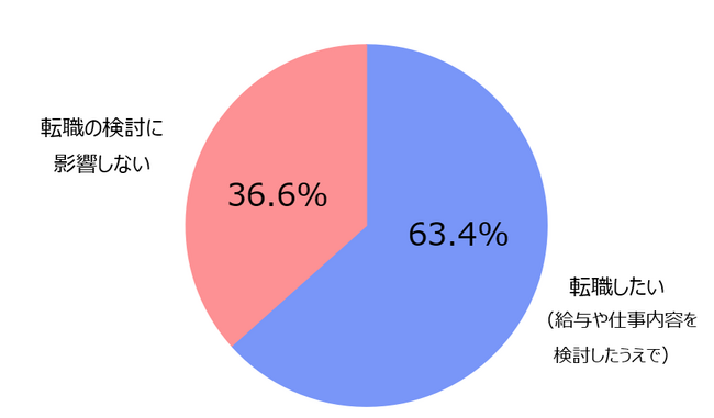 週休3日制の導入によって勤続意向年数に差が出るかを見ると、「3年以内退職意向」が男性で3.5pt減、女性で8.6pt減と、社員の定着の観点では一定の効果が得られるようだ。また、導入している会社への転職意向についても、「転職したい」は63.4%で、業務内容や給料次第では、人材獲得の面でも効果があると推察できる。【図6、7】