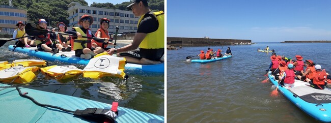 A班B班それぞれの学びの共有を目的としてシーアクティビティを取り入れたオリジナルゲームを実施しました。A班、B班それぞれが学んだことをクイズにし、A班B班混合の2チームで争います。クイズの答えをゲットする為にメガSUPに乗ってチーム毎で海に繰り出します。初めて挑戦するメガSUPの操縦に子どもたちは戸惑いながらも仲間と一緒にクイズの答えをピックアップしていました。答えを持ってきたら、なぜその答えを選んだかを発表して学びを共有しました。