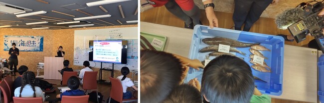 庄内浜の海岸線の長さは日本で2番目に短いにもかかわらず、日本有数の砂丘があることや130種類以上にも上る豊富な魚種が水揚げされることが紹介され、子どもたちはこれまで知らなかった地元の海の魅力に興味津々。さらに庄内浜で昔から伝わっている漁法や、旬の魚を美味しく食す食文化に触れ、先人たちの智恵や教えが今もなお脈々と受け継がれていることを学びました。