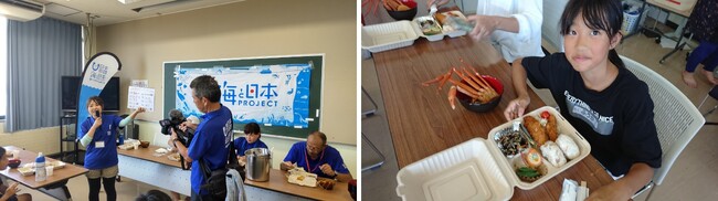 子どもたちは浜のお母さんたちの手作りご飯を美味しくいただくとともに、なぜ地元の食材を食べることに意味があるのか、旬の時期に食べる意味があるのかをクイズ形式で学びました。事業開催地の「加茂地区」独特の文化「北前船文化」を知り、より食文化について学びを深めました。