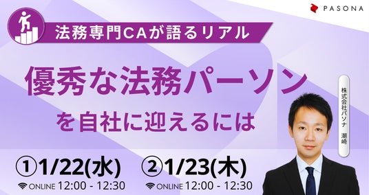 株式会社パソナは採用に関わる経営層、人事担当者を対象にウェビナー『優秀な法務パーソンを自社に迎えるには~法務専門CAが語るリアル~』を2025年1月22日(水)・23日(木)に開催いたします。