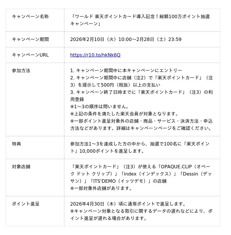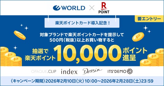 本導入を記念して、2026年2月10日(火)から2月28日(土)まで、「ワールド 楽天ポイントカード導入記念!総額100万ポイント抽選キャンペーン」を実施します。