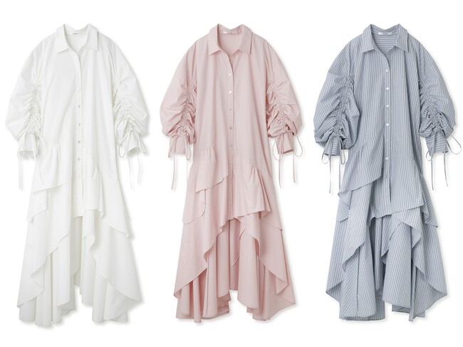 フリルがたっぷりとあしらわれたボリュームのあるデザインが印象的な、華やかな雰囲気のシャツワンピース。