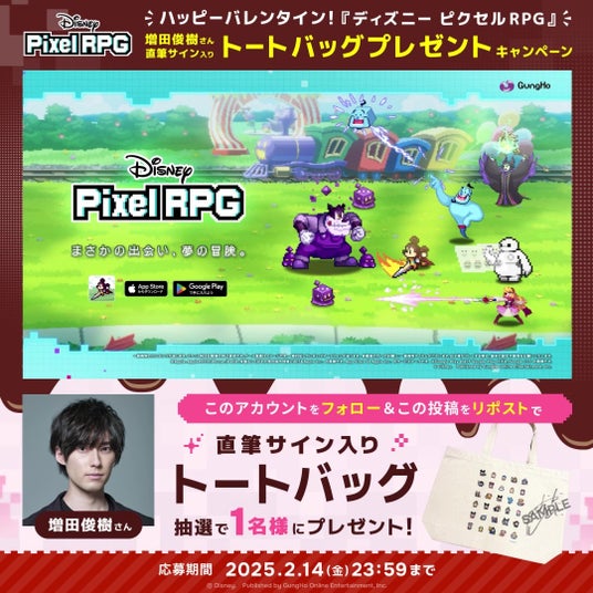 『ディズニー ピクセルRPG』のドット絵アートがプリントされた容量たっぷりのトートバッグに、増田さんのサインが入った世界でひとつだけの貴重なグッズをプレゼントいたします。皆様ぜひ奮ってご参加ください。なお、トートバッグ本品は、ディズニー公式オンラインストア(ディズニーストア .jp)内の「D-Made」にて好評発売中です。
