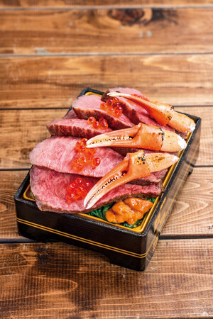 厚切りステーキにした知床牛をもりもり贅沢に入れたお弁当。海鮮入りで、北海道をたっぷりと味わえます。