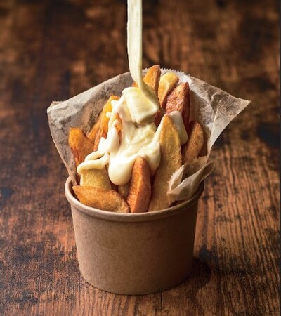 した甘味、ホクホクの食感のフライドポテトに、北海道産のチーズソースをたっぷ
