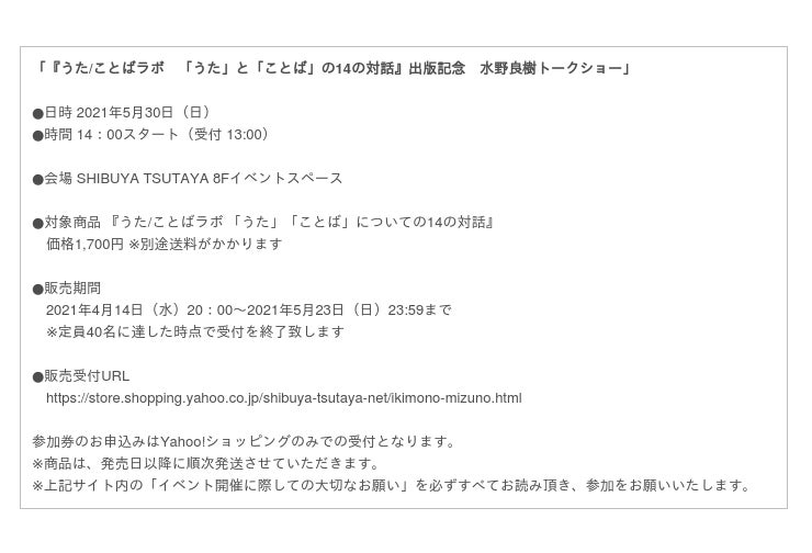 イベントゲストは関取花。本書にまつわるエピソードをはじめ、タイトルにもなっている「うた」「ことば」などについてトークを展開予定。限定40名が参加可能です。受付は、本日4月14日(水)20時~5月23日(日)23:59まで、Yahoo!ショッピング SHIBUYA TSUTAYA店にて。詳細は上記URLにてご確認ください。なお、イベントは新型コロナウイルス感染拡大対策を講じた上で行います。