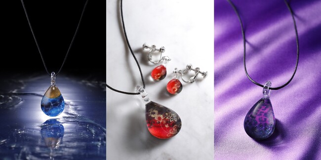 ▲[左から『海の闇、月の影』ペンダント/『天は赤い河のほとり』ペンダント、イヤリング/『闇のパープル・アイ』ペンダント]価格:ペンダント…各4620円、イヤリング、ピアス…各4400円(価格は全て税込)