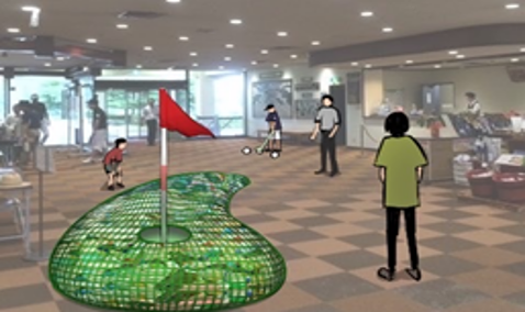 世界規模で見た場合の純粋なプラスチックリサイクル率が10%程度であることを視覚的に体感してもらうために、グリーンの10%の体積の穴を作りカップに見立ててプラスチック製品のごみを詰めたグリーンでパターゴルフを体験する。