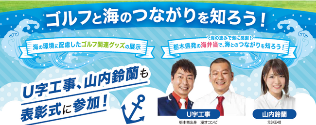 会場内では、海の環境に配慮したゴルフ関連グッズの展示や海の問題を考える展示物(※1)、栃木県発の海弁当などをご用意。トークショーでは、U字工事さん、山内鈴蘭さんをゲストにむかえ、楽しく海を学びます。