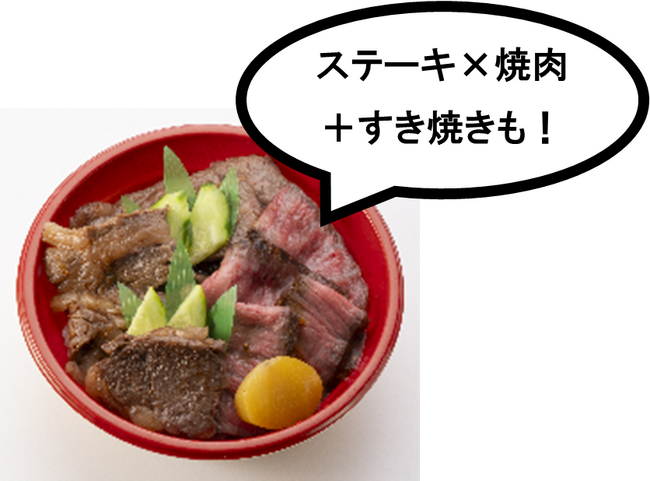 米沢牛をステーキ(ガーリック、トリュフ塩のWの味付)、焼肉(ピリ辛、醤油タレのWの味付)+ご飯の間にすき焼きに。5つの味を一つの丼で楽しめます。