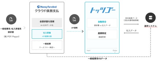 今回のAPI連携により、「マネーフォワード クラウド債務支払」で受領した請求データなどを「トッツゴー」へ連携し、請求データと仕入れ確定データの自動突合、不一致明細の確認、支払い申請、電子保管までの一連のプロセスをワンストップで実行できます。これにより、取引量が多く、原価の請求処理が複雑な製造・卸・小売業をはじめとした企業の経理担当者の請求処理工数を最大60%削減し、経理業務におけるペーパーレス化や、経理担当者の属人化の解消を支援します。