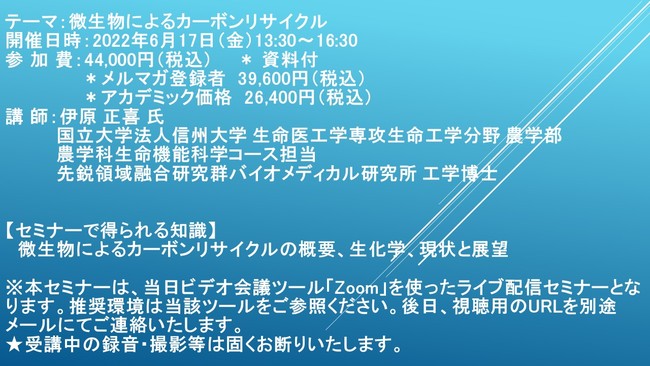 先端技術情報や市場情報を提供している(株)シーエムシー・リサーチ(千代田区神田錦町: https://cmcre.com/ )では、 各種材料・化学品などの市場動向・技術動向のセミナーや書籍発行を行っておりますが、 このたび「微生物によるカーボンリサイクル」と題するセミナーを、 講師に伊原 正喜 氏 国立大学法人信州大学 生命医工学専攻生命工学分野 農学部 農学科生命機能科学コース担当 先鋭領域融合研究群バイオメディカル研究所 工学博士)をお迎えし、2022年6月17日(金)13:30より、 ZOOMを利用したライブ配信で開催いたします。 受講料は、 一般:44,000円(税込)、 弊社メルマガ会員:39,600円(税込)、 アカデミック価格は26,400円(税込)となっております(資料付)。