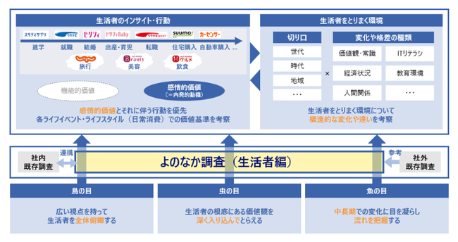 「よのなか調査」は、リクルートの事業とは直接関係しない領域も含めたより広い“よのなか”における生活者と事業者の“行動・考え方”を調査し、社会構造の変化を明らかにすることを目的とした、新しい試みです。