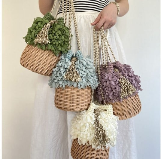 かごはもちろん、ニット部分もすべて自身で編み上げるクロッシェ作家の宮内恵さん 。アパレルのニットデザイナーの経験を生かし、季節を感じる素材やモチーフを取り入れた個性あふれるかごバッグが揃います。
