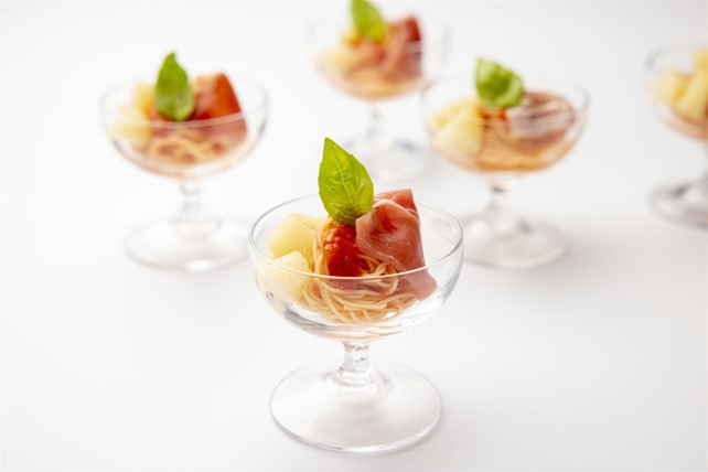 前菜としてもおすすめなのがグラスに入った一口サイズのパスタ「桃と生ハムの冷製カッペリーニ」(写真)です。やわらかな完熟桃を細麺のカッペリーニと絡めて生ハムをトッピングしました。桃の芳醇な香りと甘さと生ハムのほのかな塩気が絶妙なひんやり食感のパスタは夏の到来にピッタリの味わいです。
