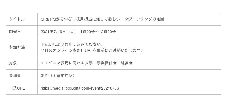 株式会社エイチームのグループ会社であるIncrements株式会社(本社:東京都港区、代表取締役社長:柴田健介)は、2021年7月6日(火)に無料オンラインセミナー「Qiita PMから学ぶ!採用担当に知って欲しいエンジニアリングの知識」を開催します。リピート開催となる今回のセミナーでは、2021年5月に開催したセミナーをさらにアップデートして解説します。