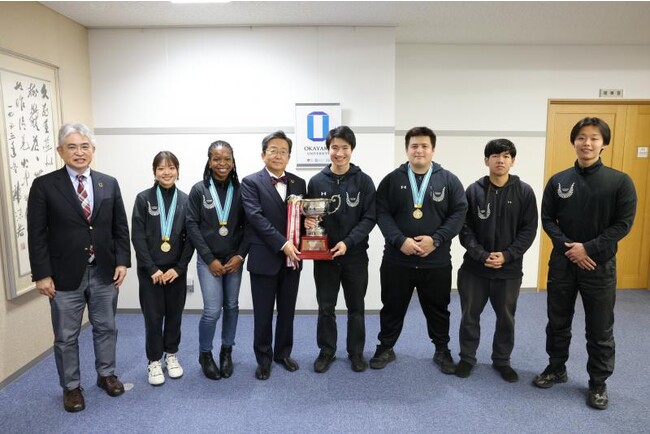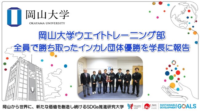 国立大学法人岡山大学(本部:岡山市北区、学長:那須保友)のウエイトトレーニング部が2023年12月1日に、本学津島キャンパスの学長室を訪れ、那須保友学長と菅誠治理事(教学担当・上席副学長)に「文部科学大臣杯争奪第50回全日本学生パワーリフティング選手権大会」での団体優勝を報告しました。