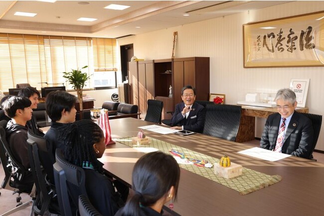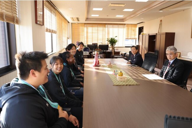 今回の報告会には、同部から、副主将の古賀健慎さん(法学部4年)、山根大河さん(法学部4年)、壷内さん、Ingyin Phooさん、Ibegwam Chigaemezu Olaedoさん(グローバル・ディスカバリー・プログラム4年)、田辺寛太さん(理学部4年)、顧問の坂入信也教授(教育推進機構キャリア・学生支援部門長)の7人が参加しました。