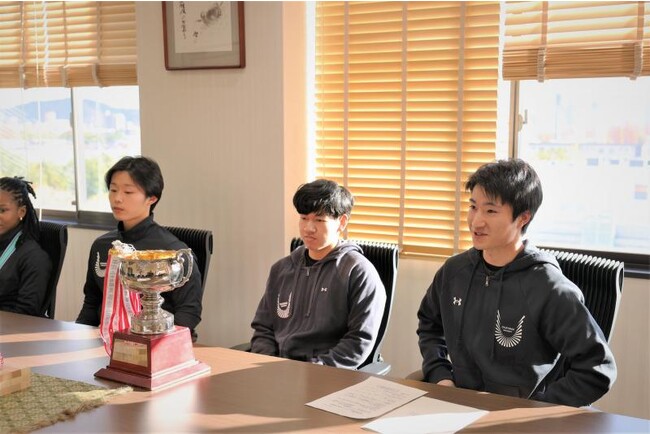 まずは、古賀さんが今回の大会結果を報告し「インカレでの4年ぶり14回目の団体優勝という結果は、部員一人ひとりが目標に向かって努力してきたこと、そして、支えてくださったコーチや顧問の先生、職員の皆さまのおかげだと思っている」と感謝の気持ちを述べました。