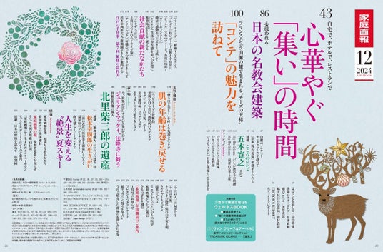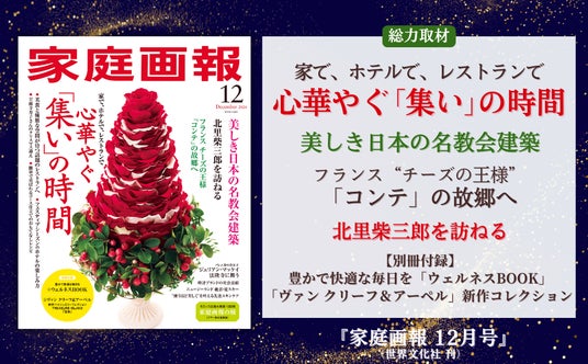 株式会社世界文化社は、『家庭画報 12月号』を11月1日(金)(関西・東海地区は10月31日)に発売しました。巻頭特集「心華やぐ集いの時間」では、ご自宅・ホテル・レストランで過ごす幸せなホリデーシーズンのひとときをご紹介。「美しき日本の名教会建築」では、心洗われる日本各地の名教会建築をご案内します。また、フランスに現地取材をし魅力に迫った「‟チーズの王様”コンテの故郷へ」や、特別インタビューによる「北里柴三郎を訪ねる」、二大別冊付録など、今年を締めくくるにふさわしい華やかな内容でお届けします。