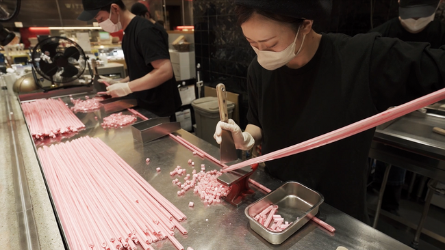 これを伸ばして細~い棒にし、リズミカルにカットすればキャンディの完成です。店頭で試食もできます。土・日・祝は1日に約5回開催。どんな柄になるかはその時のお楽しみです。
