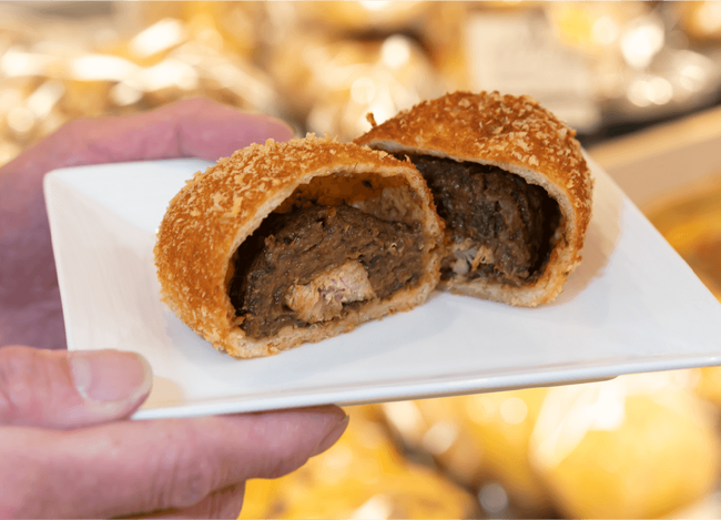 ビーフのうまみと乳製品のまろやかさを加えた中辛の欧風カレーがごろっと大きな角煮を包み込むカレーパン。