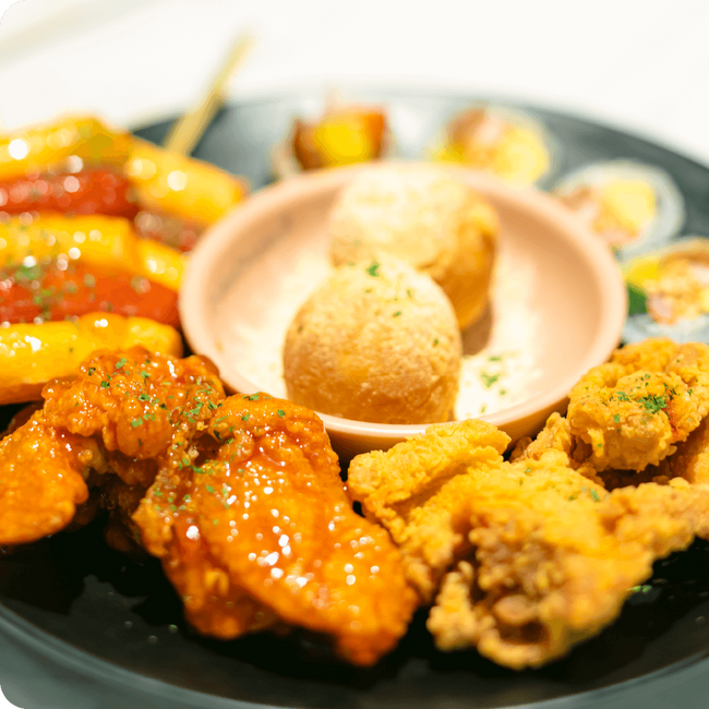 週末は特に自慢のチキン3種に、チーズボール、キンパ、ソトクソトクを集めたモクパンセットが人気です。