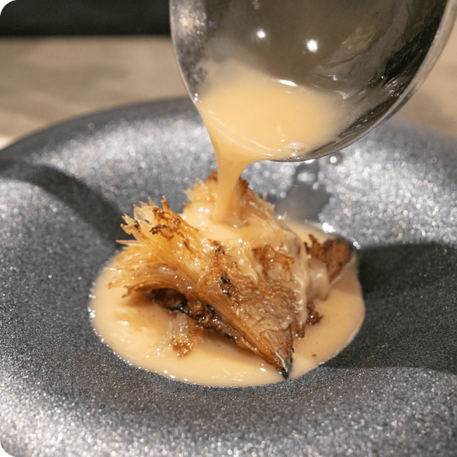 気仙沼産のフカヒレの中から選りすぐった肉厚な部分を、シェフ自慢の特製白湯スープとともに絶妙な焼き加減で仕上げます。口の中で広がるフカヒレのうまみと香ばしさにソースのコクが加わり、深い味わいが楽しめます。
