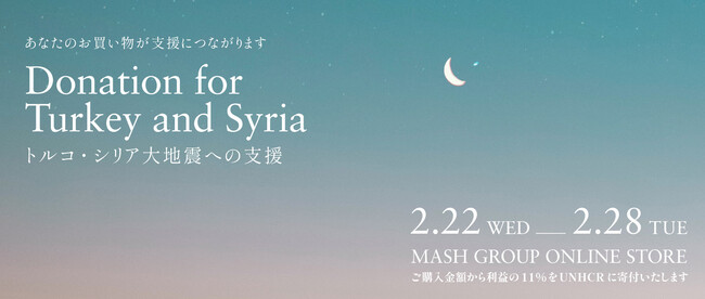 ファッション、ビューティー、フード、デザイン、不動産などの事業を展開する株式会社マッシュホールディングス(本社:東京都千代田区麹町/代表取締役社長:近藤広幸/その他事業会社を含み、以下「マッシュグループ」)は、2023年2月6日(月)にトルコ南東部で発生した地震への対する支援として、救援金の寄付を決定しました。2月22日(水)~2月28日(火)の期間中、31のオンラインサイトにおけるお客様の購入金額から利益の11%をUNHCRに寄付いたします。