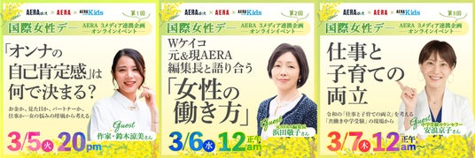 ニュース週刊誌「AERA」とニュースサイト「AERA dot.」、そして子育て情報誌「AERA with Kids」の3媒体は、2024年3月8日(金)の国際女性デーを前に、女性の悩みに寄り添い、少しでも楽しく有意義な生き方や働き方を一緒に考えるため、3月5日(火)~8日(金)の4日連続でライブ配信を行います。5~7日には、各媒体の編集長がゲストと共に女性の生き方、働き方、子育てなどをテーマにトーク。最終日の8日には、3媒体の編集長がそろって、それまでのライブ配信を振り返り、各媒体での取材などを通して見える女性をとりまく課題などについてじっくりと話し合います。