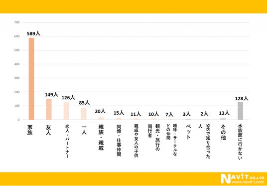 誰と水族館に行くのかたずねたアンケートです。こちらも複数回答でいただいています。「家族」と水族館に行くと回答された人が589人で、次に多かったのが「友人」で149人、3番目に多かったのが「恋人・パートナー」で126人という結果になりました。