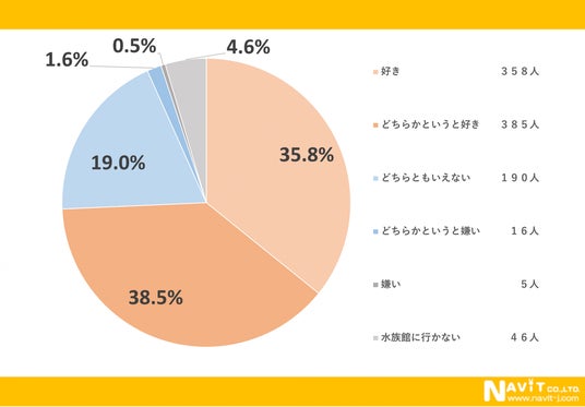 水族館は好きですか?というアンケートに対して「好き」と回答した人は35.8%で「どちらかというと好き」と回答した人が38.5%で合計すると74.3%の人が水族館に対して好意的な感情を持っていることがわかりました。