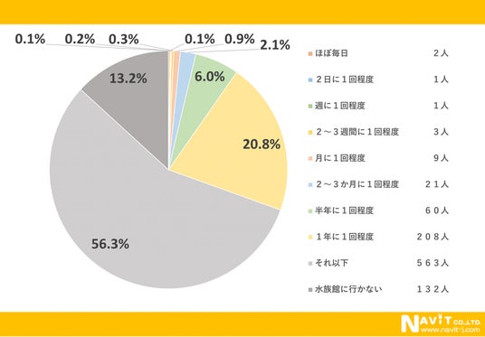 水族館へ行く頻度についてたずねたアンケートです。一番多かったのは「1年に1回程度」で20.8%でした。次に多かったのは「半年に1回程度」で6.0%。3番目は「2~3ヶ月に1回程度」で2.1%という結果になりました。