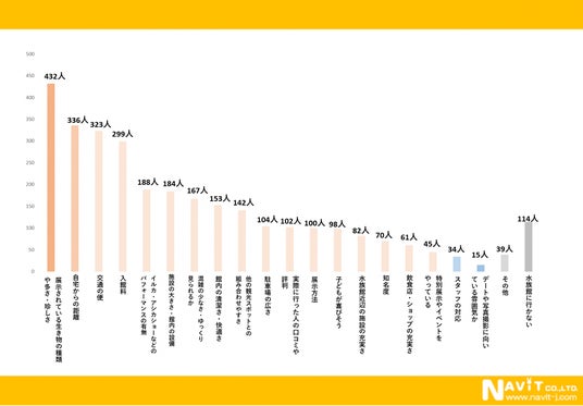 こちらは複数回答で回答をいただきました。水族館を決めるポイントについてのアンケートです。一番多かったのは「展示されている生き物の種類や多さ・珍しさ」で432人、次に多かったのは「自宅からの距離」で336人、3番目は「交通の便」で323人という結果になりました。やはり行きやすいというのは大事ですね。
