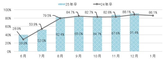 25年卒学生の12月時点でのインターンシップ・仕事体験の参加割合は前年から3.3pt増の91.4%となった。インターンシップの定義改正が行われるなど、学生の関心も高まり参加率が上がっているようだ。【図1】