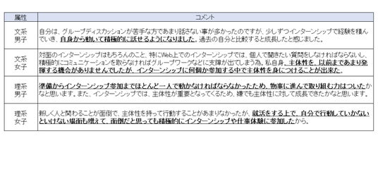 インターンシップや就活準備での経験を通じて成長したと感じることを、社会人基礎力で示されている12個の力から最もあてはまるものをひとつ選んでもらい、その理由を聞いたところ、最も多かったのは前年と同様で「主体性」で30.2%だった。理由は、「以前まであまり(主体性を)発揮する機会がなかったが、インターンシップに何個か参加する中で主体性を身につけることが出来た」「準備からインターンシップ参加までほとんど一人で動かなければならなかったため、物事に進んで取り組む力はついた」など、これまでとは違う経験をしたことで、新たに「主体性」という力を身につけることができた、という回答が目立っており、行動を起こせた自分に成長を感じている様子がうかがえた。【図3、4】