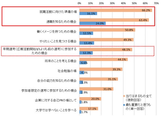 インターンシップの位置づけを聞いたところ、複数回答で当てはまるものすべてを選択してもらった場合は「就職活動に向けた準備の場」が最多で66.2%、最も重要だと思うものを単一回答で選択してもらった場合は、「適職を知るための機会」が最多で24.0%となった。25年卒においてはインターンシップの定義が改正され、「広報活動開始後」という条件があるものの、インターンシップ参加時の情報を採用選考に利用できるようになった。インターンシップ期間から就職活動を意識する傾向も高まっており、「早期選考に参加するための機会」※1という回答も複数回答で48.1%と半数近くになった。しかし、それを最大の目的とするのではなく、キャリア形成を目的としてインターンシップに参加している学生も多いようだ。【図2】