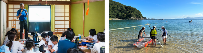 雨についての様々なメカニズムを学んだ子どもたちは、雨を循環させる役割を担う川と海へ向かい、実際にその様子を取材します。水の透明度の高さで有名な銚子川では、山に降った大量の雨がろ過され、ミネラルを含んだ豊かな水が川を通じて海へ運ばれていくことを学びました。その後は、紀北町の城ノ浜ビーチからスケルトンのシーカヤックに乗って海へ。これまでの取材や学びを生かして海の上から尾鷲の地形を観察しつつ、海水温の上昇など海洋環境の変化によってもたらされた、ガンガゼという生き物の増加による磯焼けの様子などを、自分たちの目で見て取材し、このままでは豊かな尾鷲の海の環境が変わってしまうかもしれないという危機感を、子どもたちは身をもって感じていました。