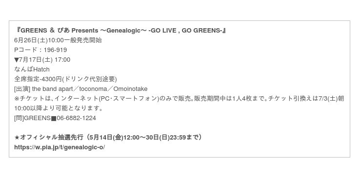 7月17日(土)、なんばHatchにて『GREENS & ぴあ Presents ~Genealogic~ -GO LIVE , GO GREENS-』の開催が決定しました。